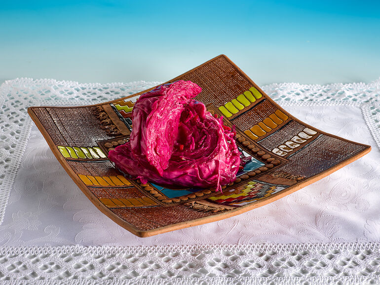 После того, как капуста постоит три-четыре дня в тепле и три-четыре дня на холоде, порежьте сладкий фиолетовый лук.