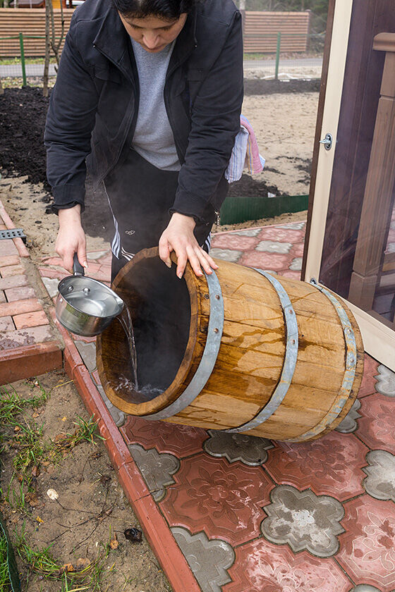 Воду сразу не выливайте, покатайте ее в бочке туда-сюда. И так, пока все двадцать литров кипятка не кончатся.