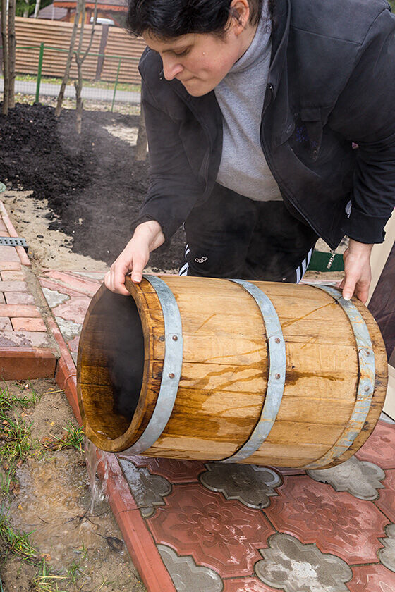 А потом надо вскипятить литров двадцать воды и лить кипяток в пустую бочку вот так, по краю, чтобы ошпарить ее как следует.