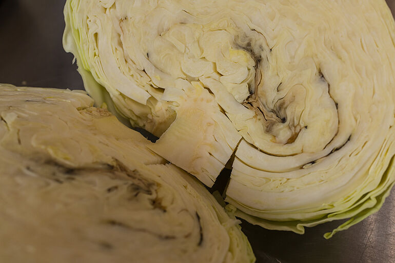Если попадется вот такая капуста, то не надо спасть "хорошую часть", выбрасывайте весь кочан, чтобы потом не пришлось выбросить всю бочку. Нож после такой капусты лучше помыть, а если и разделочную доску испачкали гнилью, то и доску.