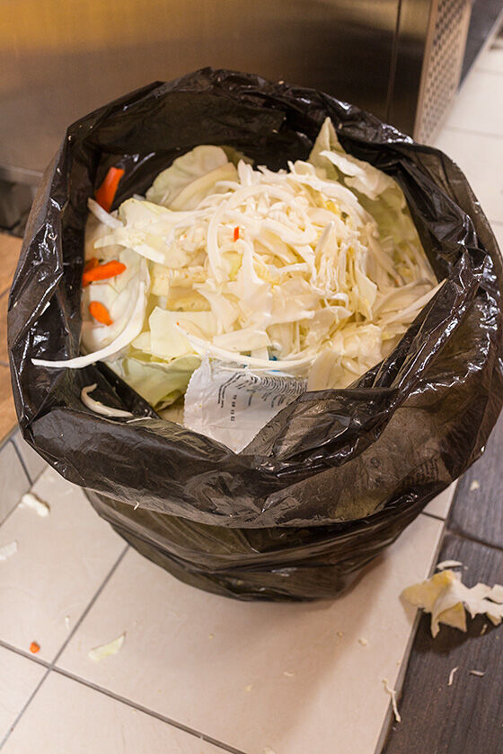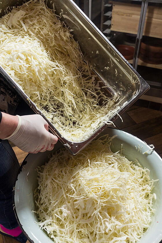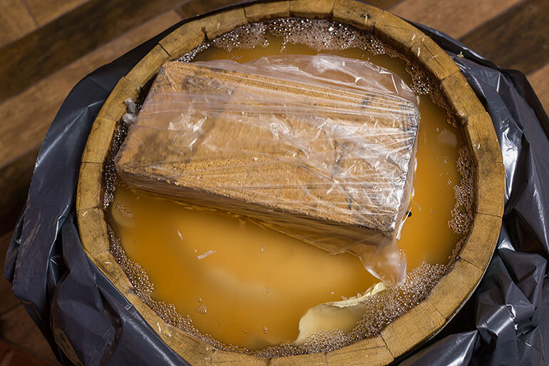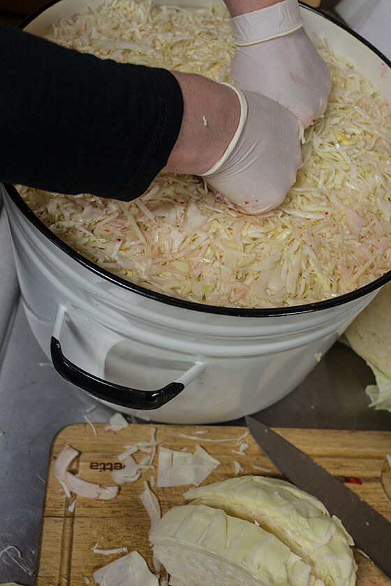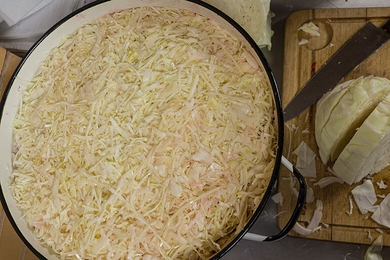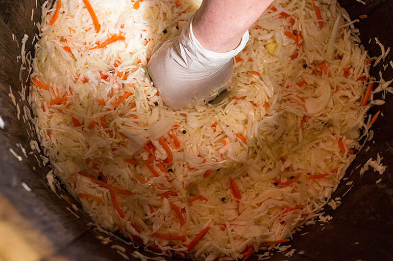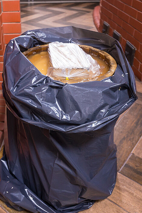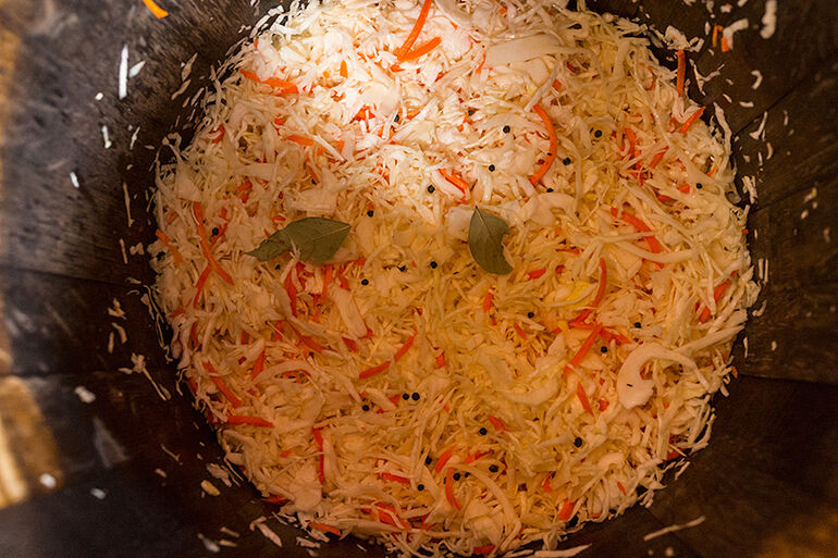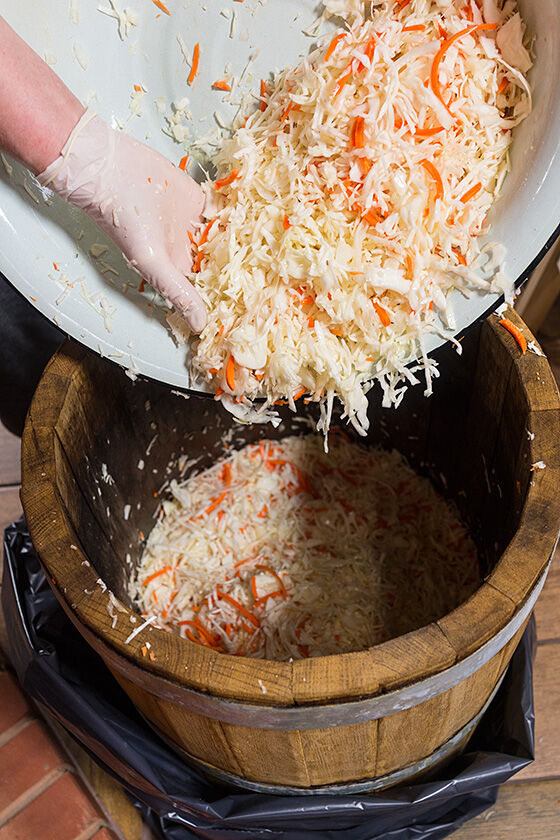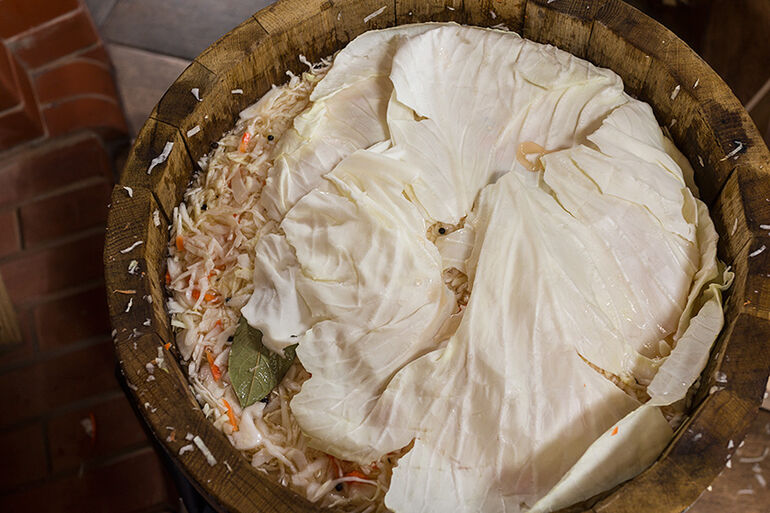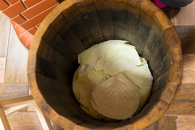 Да, особые бактерии, которые отвечают за сквашивание. Одним из продуктов их жизнедеятельности являются газы. Эти газы будут собираться в пузырьки, и путь этих пузырьков наверх, через утрамбованную капусту не близок. Но объем жидкости за счет содержащейся в ней пузырьков газа увеличится и может случится так, что капустный сок даже побежит через край бочки. На этот случай мы одели на нее мешок, чтобы не собирать потом капустный сок по полу кухни.