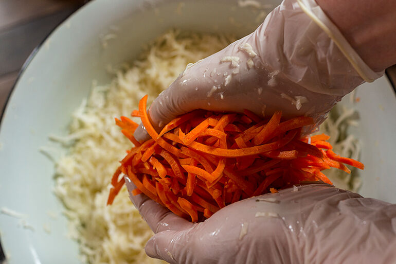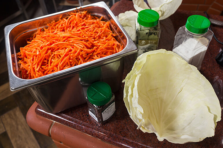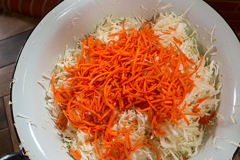 На тазик капусты две вот такие горсти моркови.