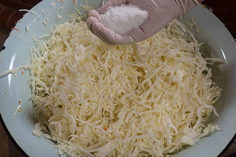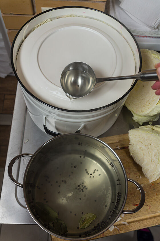 Сколько килограмм капусты пошло у вас в эту кастрюлю? С самого начала надо было отмерить соли 2% от веса капусты. Часть ее пошла на мелко шинкованную капусту, а остальная - сюда.