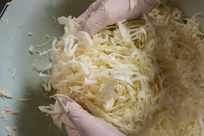 Засыпьте сверху капустой, перемятой с солью.