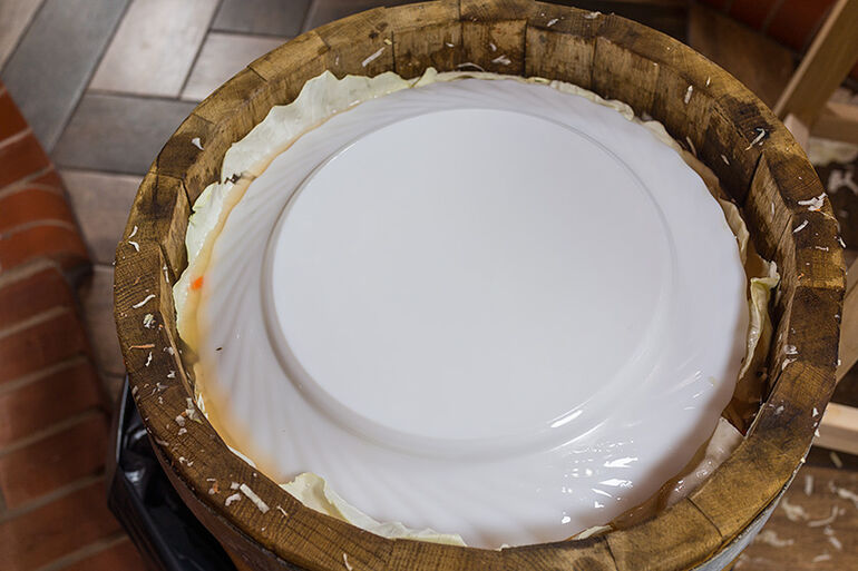 За время, что прошло с первого ряда, капуста уже начала пускать сок. Внимание, не заполняйте бочку до краев, оставьте свободное место!