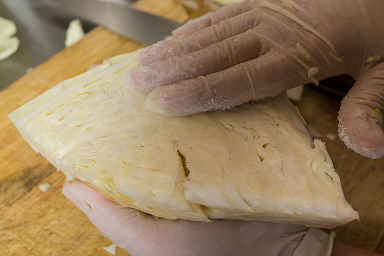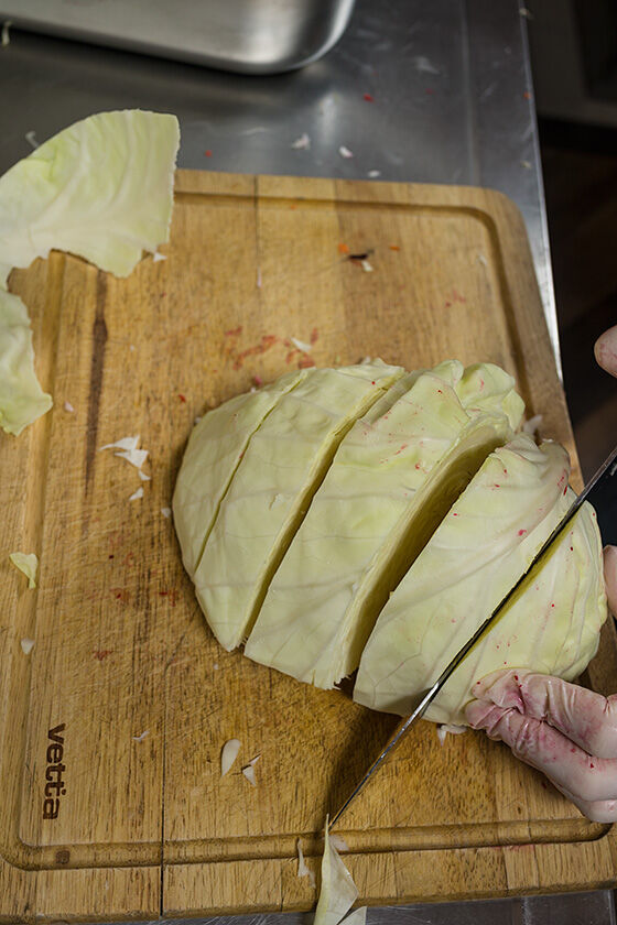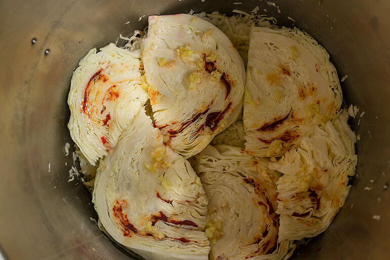 Большую часть капусты нарезать ломтями, а примерно треть нарезать соломкой.