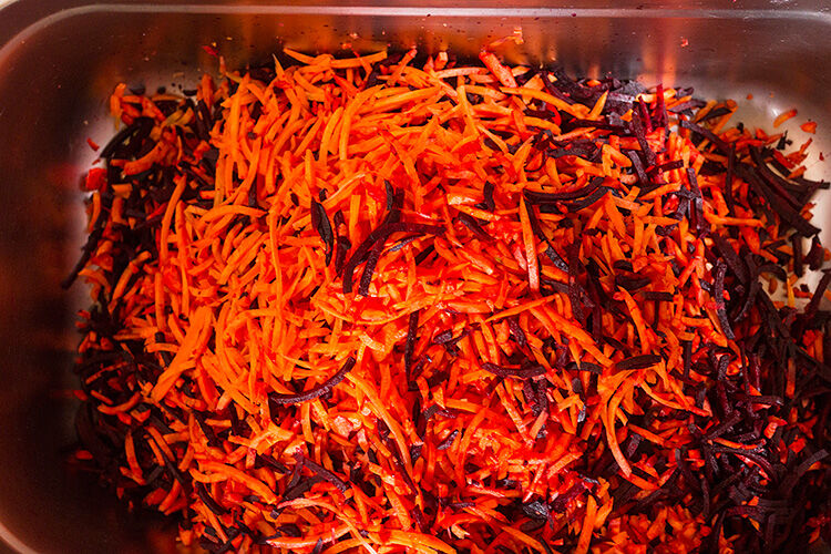 Морковь и свеклу порезать соломкой и перемешать.