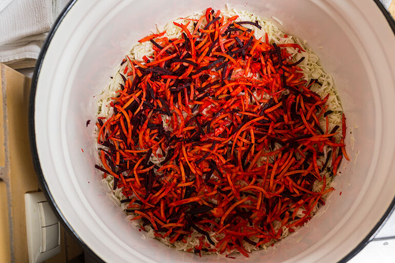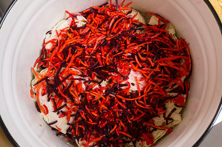 Уложить слой капусты ломтями и засыпать его свеклой и моркови.