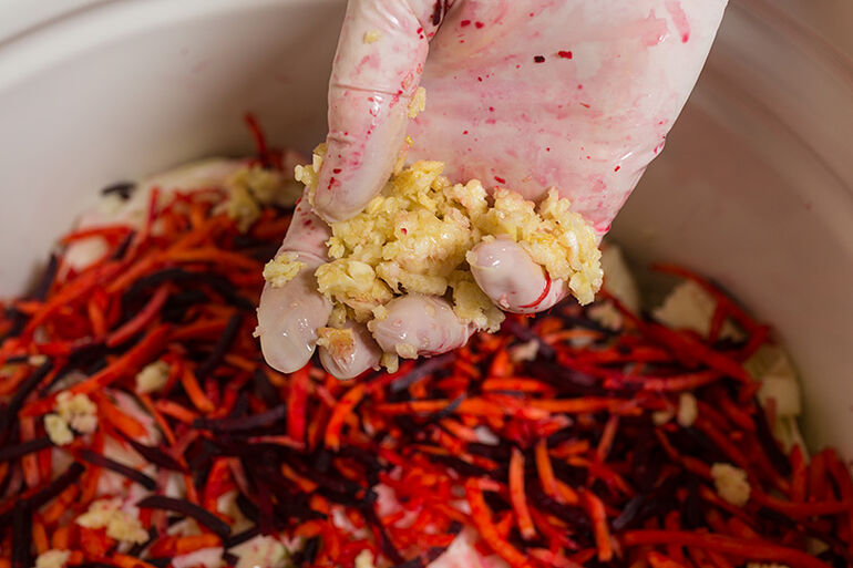 Посыпать морковь и свеклу давленным чесноком.