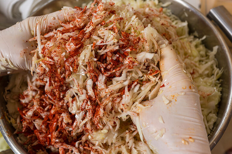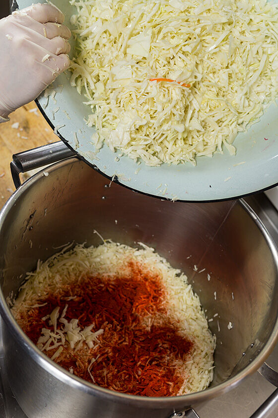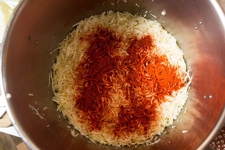Пересыпайте шинкованную капусту паприкой. Выбирайте жгучесть паприки по своему вкусу, либо смешивайте сладкую паприку со жгучим перцем чили, пока не получите желаемый вкус.