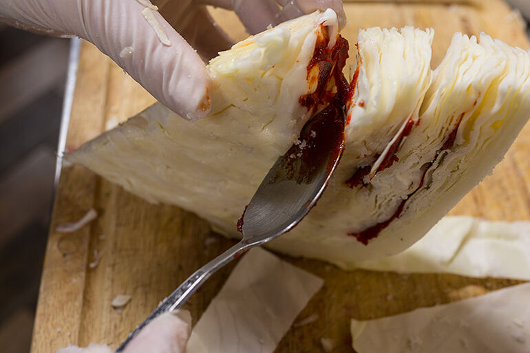 Между листьями, через три-четыре листа, намажьте перечную пасту.