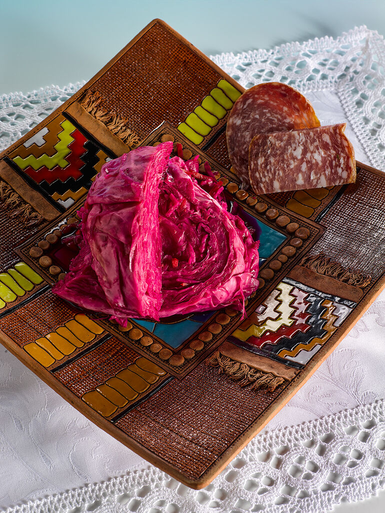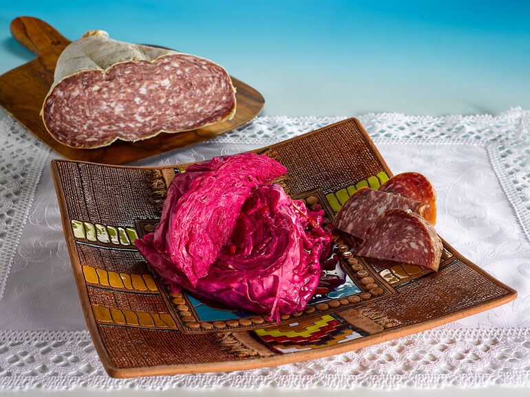 Красную кисло-сладкую капусту хорошо подавать с мясными закусками, да хоть с вяленой бараниной!