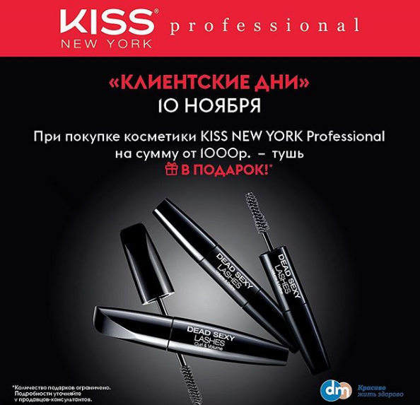 В течение всего дня вас ждут: бесплатный макияж без предварительной записи, скидка 20% на всю продукцию бренда и подарок за покупку от 1000 рублей* - тушь для ресниц DEAD SEXY LASHES!