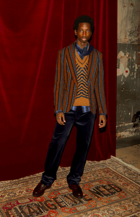 Angela Missoni pays a special tribute to a fancy NYC dandy for the 80"s, with all his creative artsy looks and allures and make as usual some of her strong statements. Sartorial touch is seen in reversible montone furs served as hampers, velvet couture pants - and creativity is seen from the bohemian scarfs, coats and hats. Amazing mix of lovely patterns as usual.