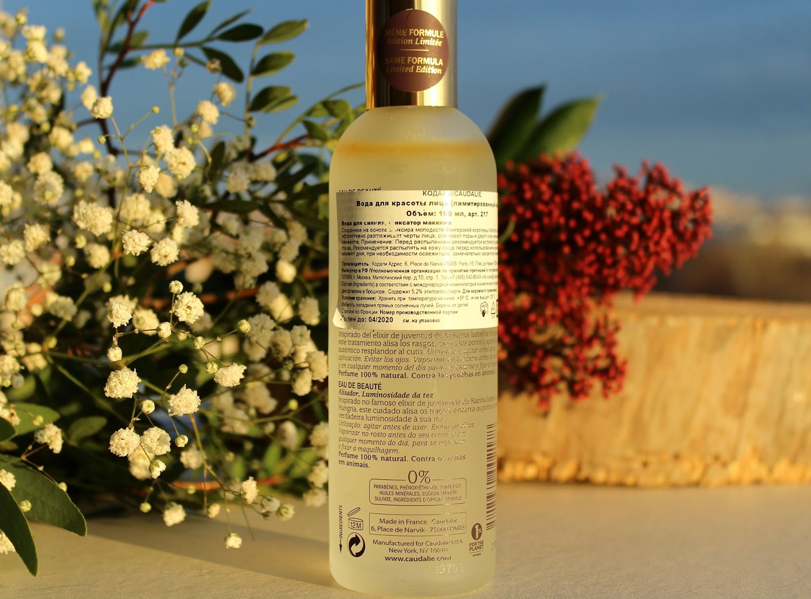 Caudalie Beauty Elixir сочетает в себе свойства тоника и сыворотки, борется с первыми признаками старения и последствиями неблагоприятных внешних воздействий. В составе гидролат цветов апельсина, эфирное масло розмарина, мяты, мелиссы, дамасской розы, экстракт винограда, витамин Е..