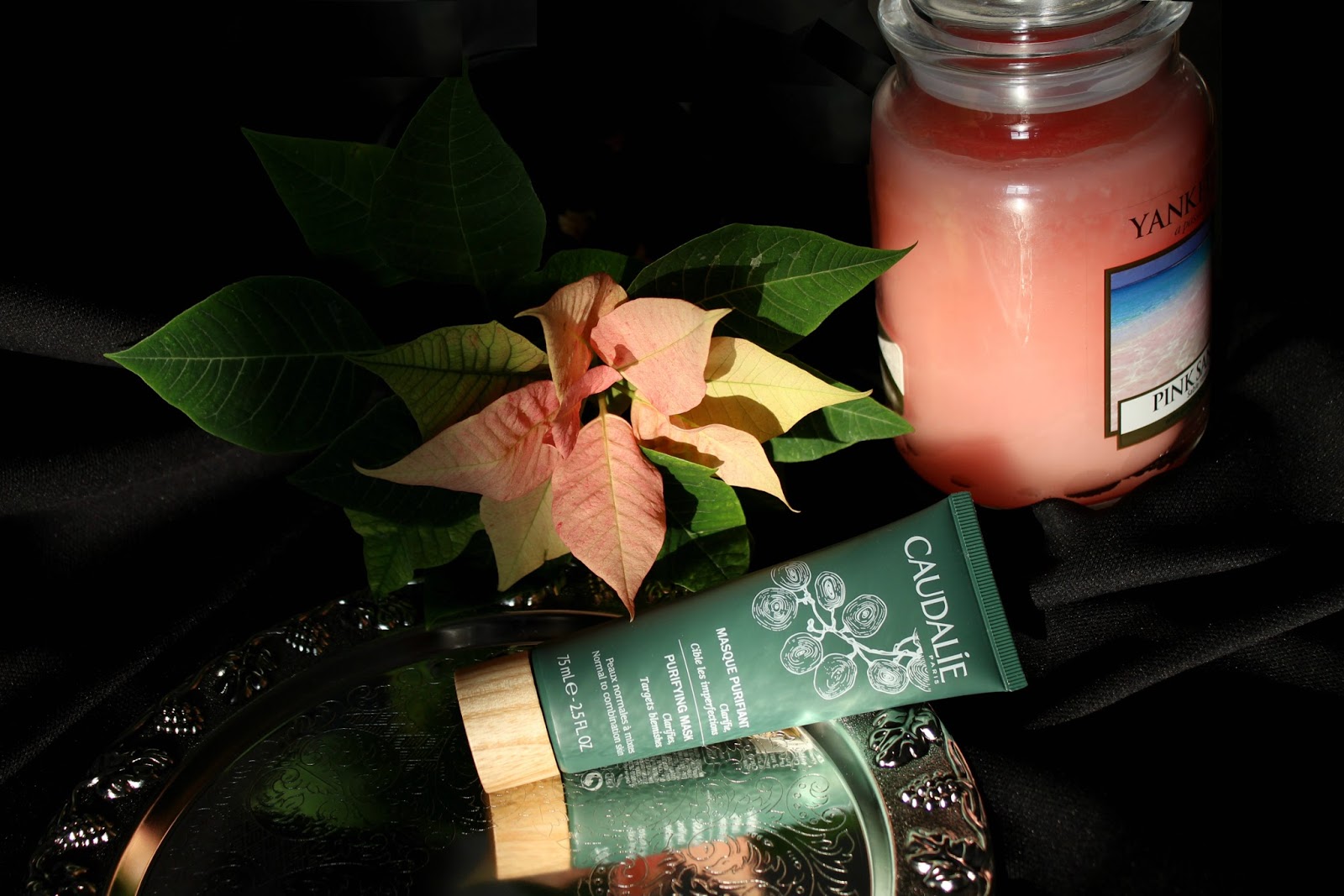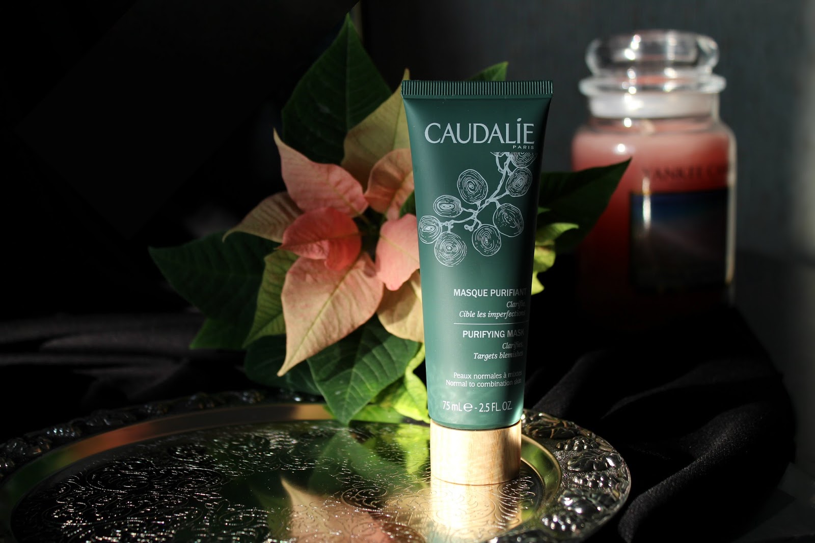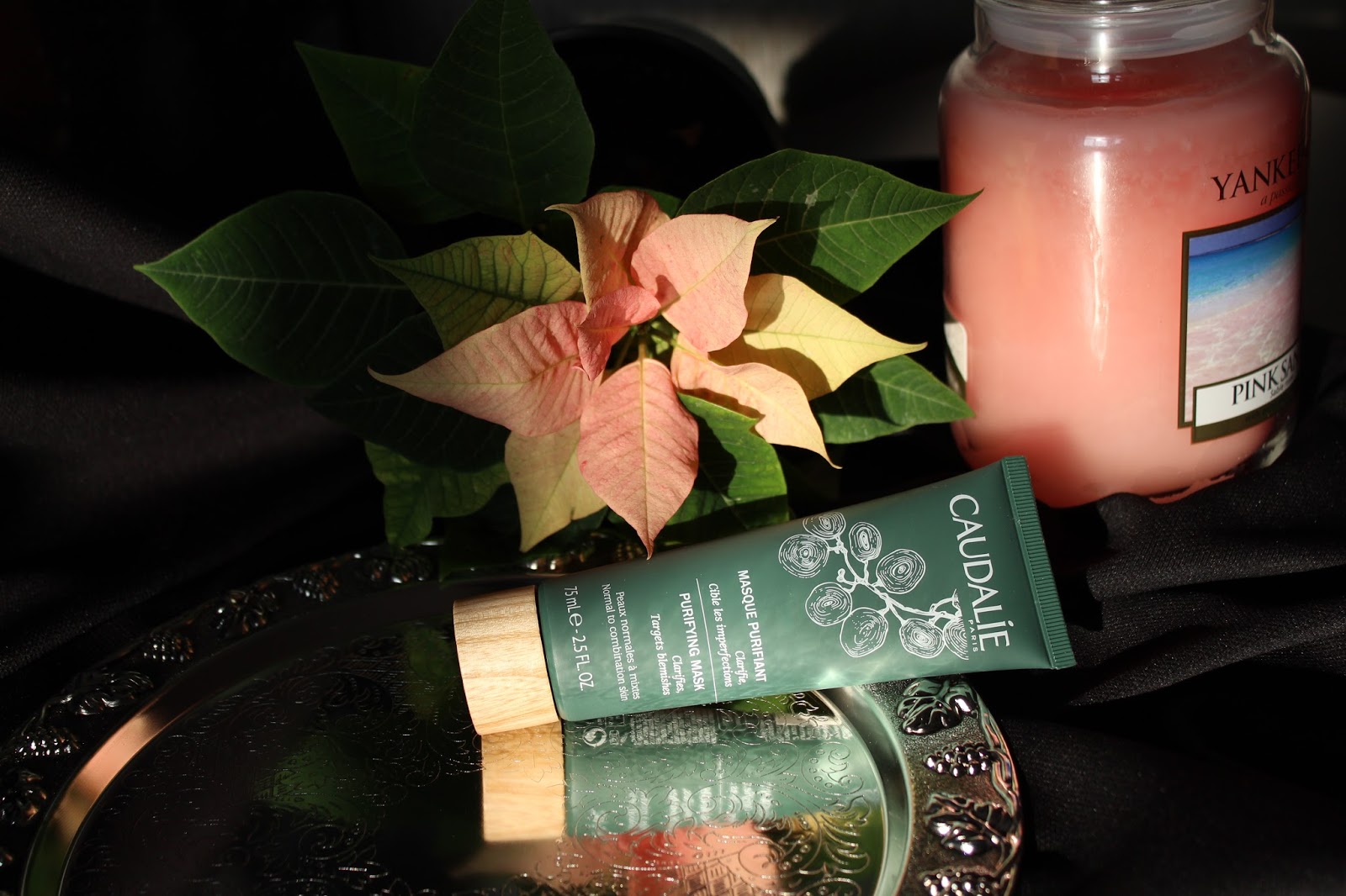 Маска белая, глинистая, пахнет арома-маслами, в составе: бентонит и каолин, масла винограда, бергамота, кипариса, шалфея, мирры, сандала, ромашки римской, семян петрушки, экстракт семени льна.