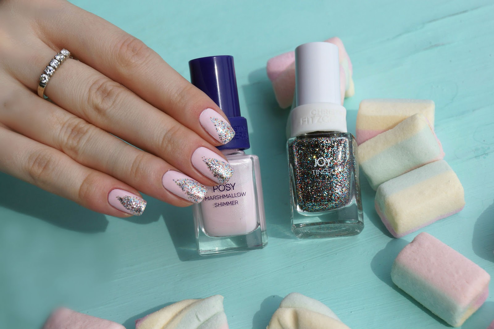 Christina Fitzgerald Joy Tinsel я использовала для акцента, он состоит из густо замешанного разноцветного глиттера, ложится ровно, гладко, сохнет быстро, держится долго, удаляется без особых усилий.