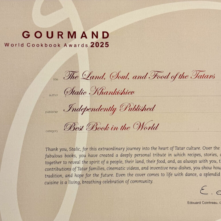 Спасибо, Сталик, за это необыкновенное путешествие в сердце татарской культуры. На протяжении многих лет, благодаря своим сказочным книгам, вы создали глубоко личную дань уважения, в которой рецепты, истории и воспоминания объединяются, чтобы раскрыть дух народа, его землю, их еду и, как всегда с вами, их музыку. Благодаря вкладу татарских семей, кинематографическим видео и изобретательным новым блюдам вы показываете, как еда несет в себе историю, традиции и надежду на будущее. Даже обложка оживает с танцем, великолепным напоминанием о том, что татарская кухня - это живой, дышащий праздник сообщества.