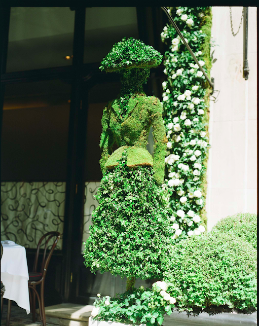 A London gastronomic landmark, this elegant restaurant is located only a few steps from the Mount Street boutique. The terrace, bedecked with floral compositions, is backed by vertical garden walls.Planters of white roses, with the initials CD, showcase topiaired trees in the form of the iconic Bar suit, the emblematic silhouette from the New Look.