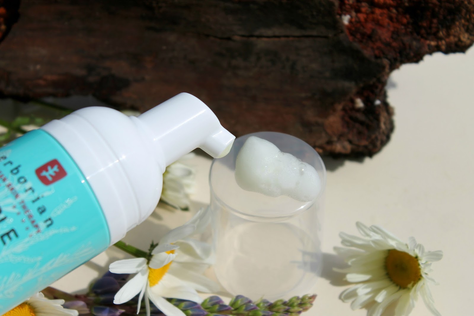 Средство выглядит внешне очень симпатично - флакон бирюзового цвета оснащен удобным дозатором, для умывания достаточно нажать 1-2 раза. Пенка имеет травяной аромат, очень лёгкая, воздушная, мелкоячеистая.