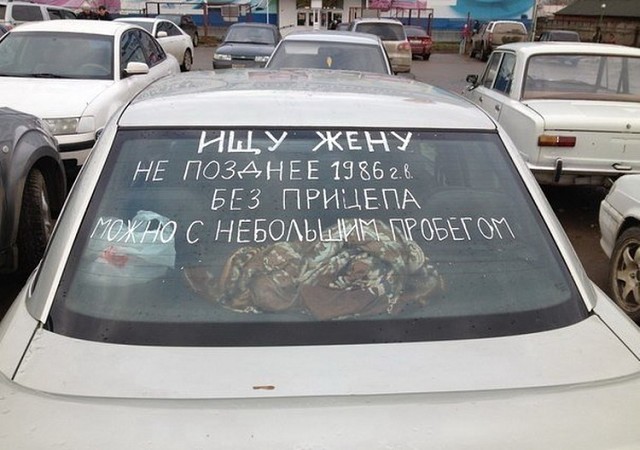 об одном из современных способов найти себе супруга. Насколько серьезно настроены люди, которые пишут » Ищу жену» на стекле своего автомобиля и указывают номер своего телефона? Эти люди достаточно открыты и не скрывают своих намерений и даже личной информации и обычно эти действия вызывают симпатию и положительную реакцию. Возможно, этим хорошим людям не хватало именно такого простого шага, чтобы найти свою любовь?