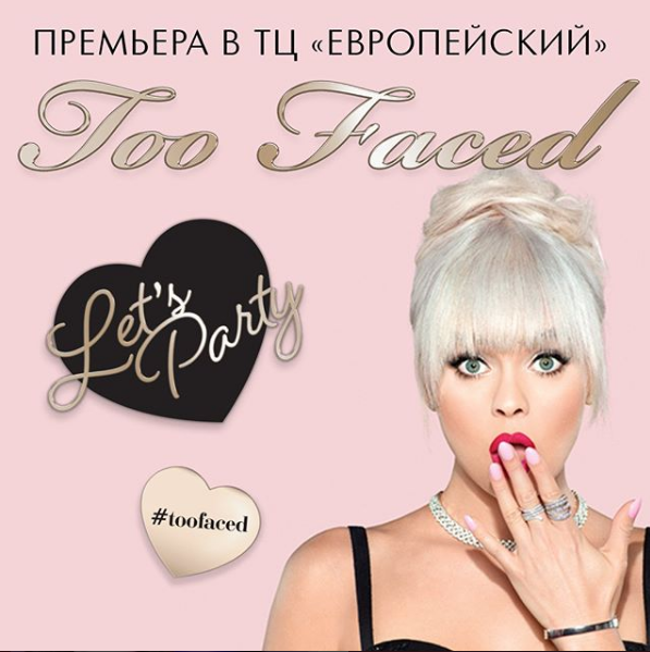 Уже завтра - 4 ноября в ИДБ ( ТРЦ Европейский) будет проходить праздник в честь запуска марки! Первых 30 покупателей продукции Too Faced ждет комплимент – косметичка с миниатюрой туши-бестселлера Better Than Sex! А также все покупатели имеют возможность выиграть нереальные суперпризы: огромную коробку с продукцией марки и роликовыми коньками! Брендированные очки и коробку пончиков :)