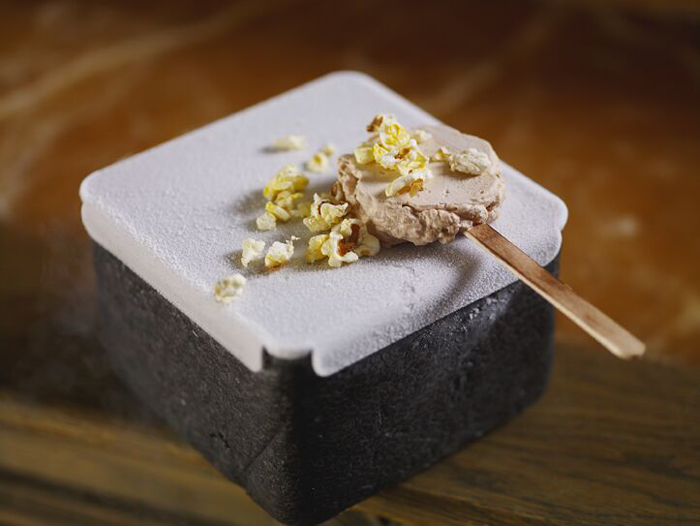 Lollipop with caramel apple, goose liver terrine with coffee spaghetti