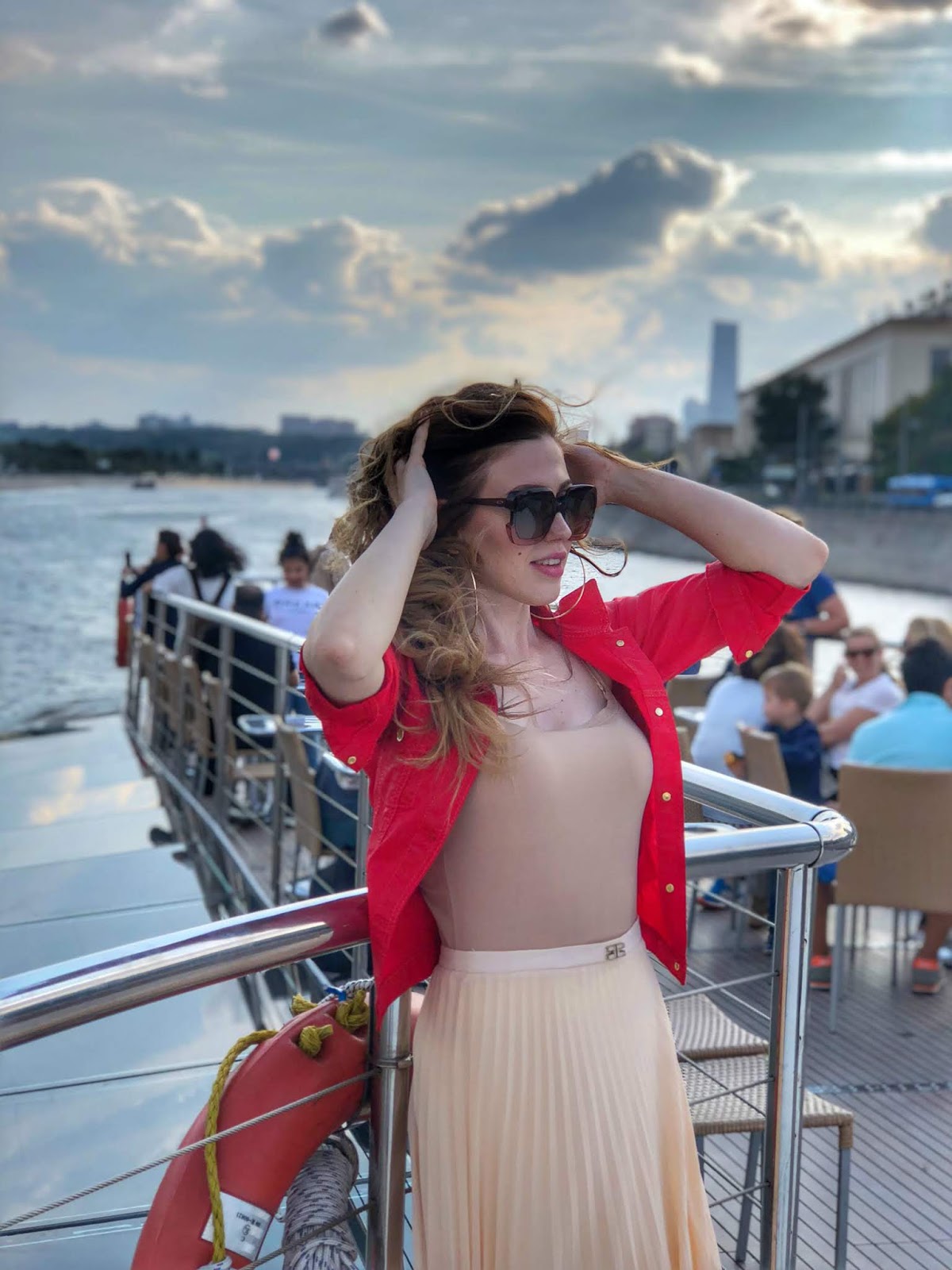 Средство жидкое, гелеобразное, с чудесным фруктовым ароматом, легко распределяется, волосы не склеивает, объем сохраняет. Нужно нанести немного жидкости на волосы, равномерно распределить и выполнить укладку. Локоны выглядят естественно и сохраняются даже при ветреной погоде, как например у меня, во время речной прогулки по Москва-реке.