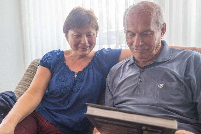 Я нашел дядю Люцика в Германии. Вот они с Лилей рассматривают мою первую книгу о шашлыке.