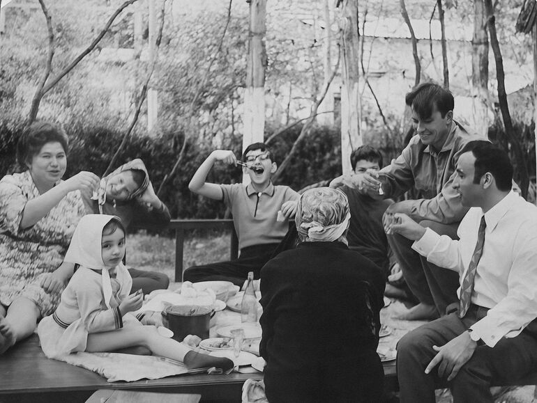 Это моя сестренка, Эльмира, потом Людмила Алексеевна, мамина подруга и супруга дяди Люцика, за ней Лиля, дочь дяди Люцика, потом я и шашлык, Сережку, сына дяди Люцика, совсем перекрыли руки, сам дядя Люцик, мой отец, а спиной сидит бабушка - мать дяди Люцика.А потом все перебирались на топчан — и наступало то самое счастье, которым я хочу поделиться с вами через эту книгу.