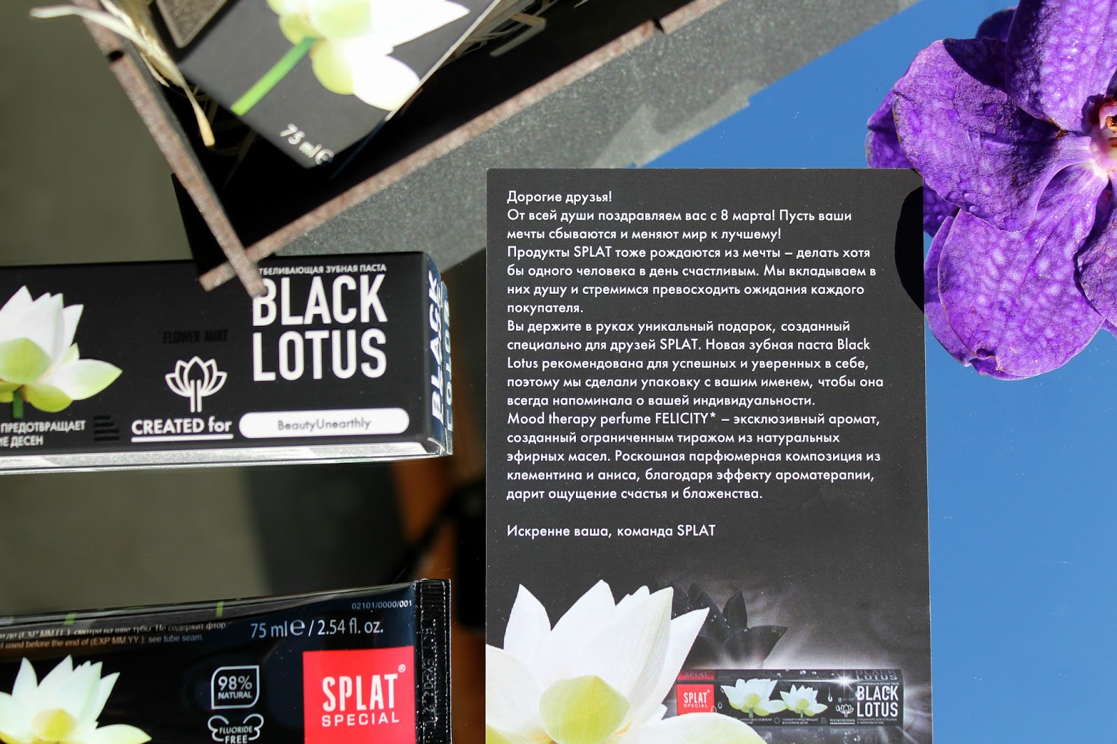 Мультикомпонентная черная зубная паста Splat Special Black Lotus осветляет эмаль зубов, возвращая им природную белизну и блеск, эффективно очищает от налета и бактерий, за счет входящей в состав пудры бамбукового угля. Экстракты индийского лотоса и граната обладают антибактериальным действием, экстракт белой орхидеи укрепляет десны, розовая вода и мята освежают дыхание. Паста не содержит фтора, SLS, парабенов, подсластителей и синтетических красителей.